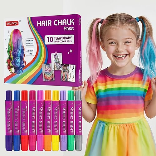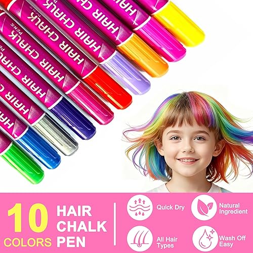 Vibrant Washable Hair Chalk Set - 10 Colors with Glitter! 1.Perfect Kids Gift: Temporary Non-Toxic Easy Washable Hair Dye Colourful Pens Awesome birthday, Christmas, Easter, or party presents for girls & teens ages 6+. Fun for any occasion.Great for creative fun or parties!