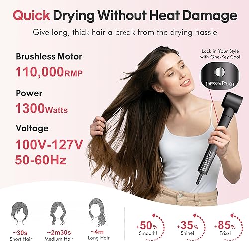 Quick Drying: The hair dryer brush blow dryer with 110,000 RPM high-speed brushless motor, and powerful airflow of up to 23m/s can accelerate drying, and shorten your styling time in half, saving you time and effort