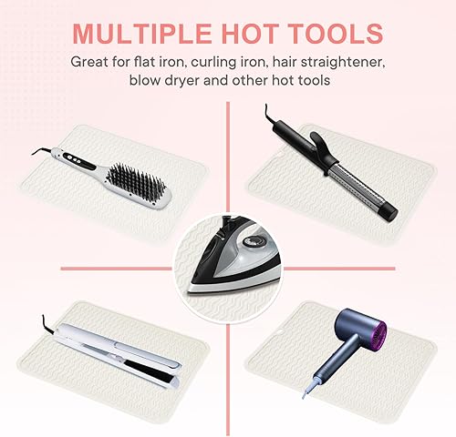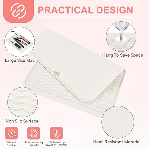 PRACTICAL DESIGN: Our hot tools mat cover is designed with hanging hole to save space; This silicone mat with excellent flexibility can easy roll up and and secured with velcro; Unique wave texture design of the hair straightener mat skid-proof keeps your hot hair tools from slipping while grips on the surface