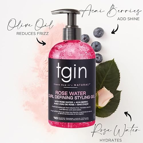 Product Benefits: Black, Women Owned: Our team at tgin is 96% women and 100% Black-owned. Our products do not contain sulfates, parabens, petrolatum, lanolin, artificial colors, and we do not test on animals., Curls N’ Roses is formulated for anyone looking for lightweight moisture that defines their kinks, curls, and waves. Great for low porosity hair., Our Rose Water Curl Defining Styling Gel is highly effective for defining curls, reducing frizz, and boosting volume. Give your curls all the definition without being weight down. This gel is a medium hold with a crunch-free finish, creating defined curls for days. Lackluster curls are given life, and frizz is diminished with each use!, Our Rose Water Smoothing Leave-In Conditioner is designed to add shine and body to dull hair while providing all-day moisture. This sulfate and paraben free moisturizer works to seal in moisture while protecting hair from free radicals and stabilizing hair’s pH balance., Rose Water Defining Mousse reduces hair loss, defines curls, and controls frizz. Provides a medium hold when styling for touchably soft, defined curls! Hair is left defined and shiny without the flake or crunch of traditional mousses., The Curls N Roses line provides lightweight moisture and maximum definition without buildup. A common complaint of those with finer textures or low porosity hair is that products are too heavy or cause buildup. This line solves all of these issues. See more
