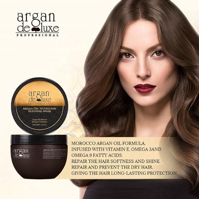 LUXURY SET CONTENTS: Professional hair care kit includes a 50ml Argan Oil Hair & Body Serum and a 250ml Nutrition Infusing Hair Mask in elegant packaging