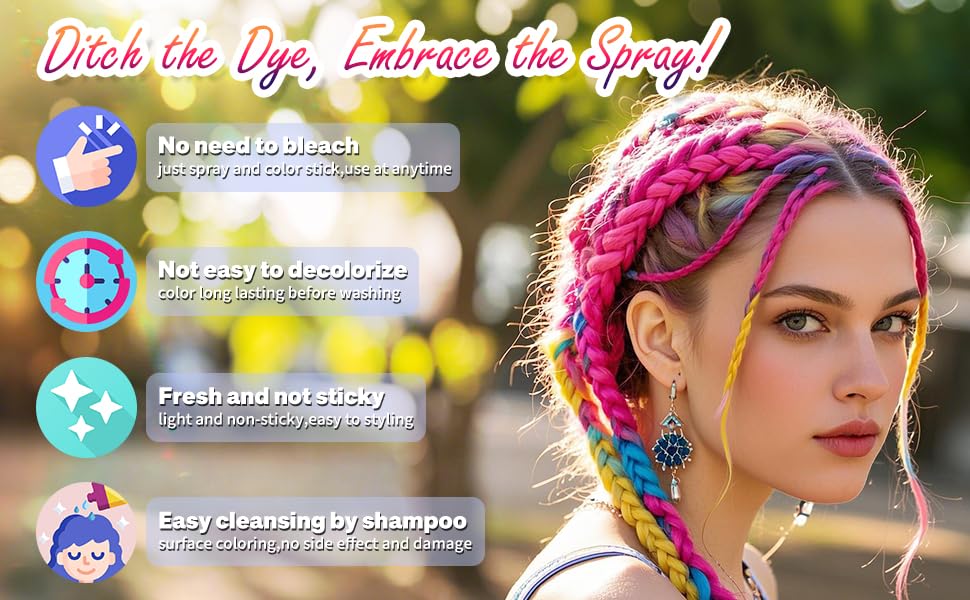 4.Safe & Skin-Friendly& Safe for All Hair Types: Made with mild, cruelty-free ingredients, this spray is suitable for women, men, and kids—even pets! It conditions hair while providing temporary color, with no damage or stickiness.