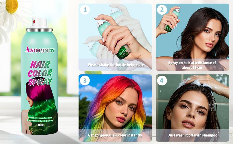 2.Natural Ingredients & Cruelty-Free Temporary Green Hair Spray: Made of quick-drying formula,the dye dries quickly on the hair and is not easy to clump and fade,keeping hair soft and shiny.Natural ingredients,suitable for all hair type.